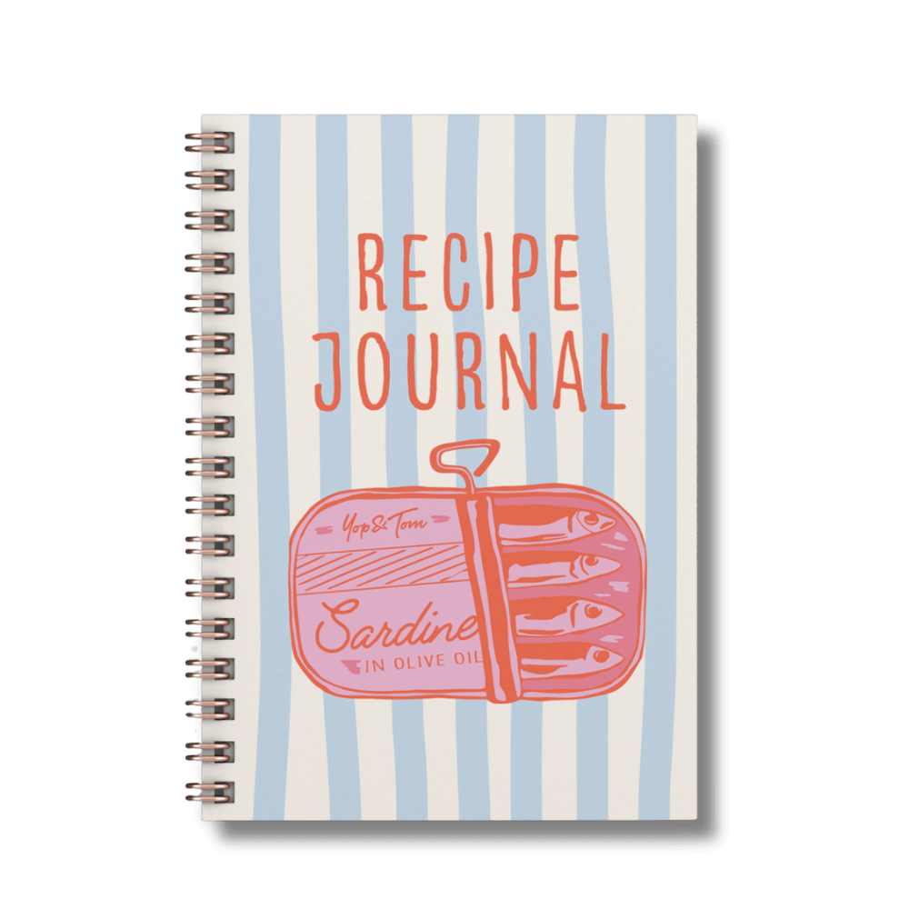 Elevate your culinary creativity with this one-of-a-kind recipe journal featuring a quirky sardine can design on a backdrop of charming blue and white stripes.